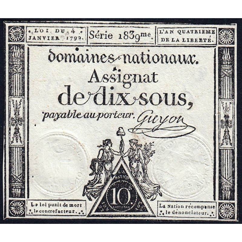 Assignat 23a - 10 sous - 4 janvier 1792 - Série 1839 - Etat : TTB+