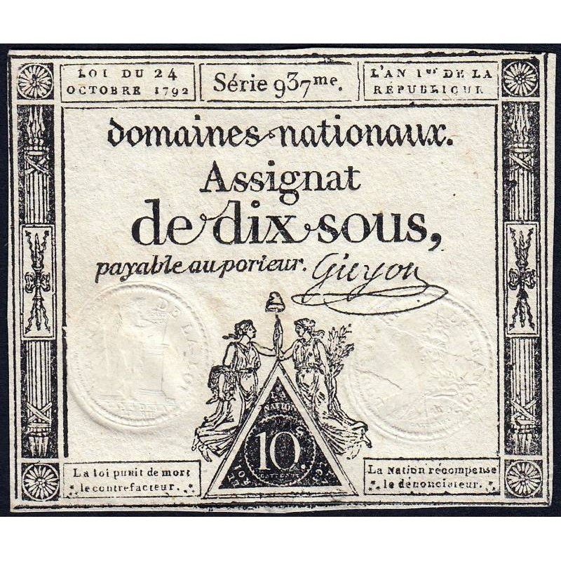 • Assignat 34a - 10 sous - 24 octobre 1792 - Série 937 - Etat : TTB