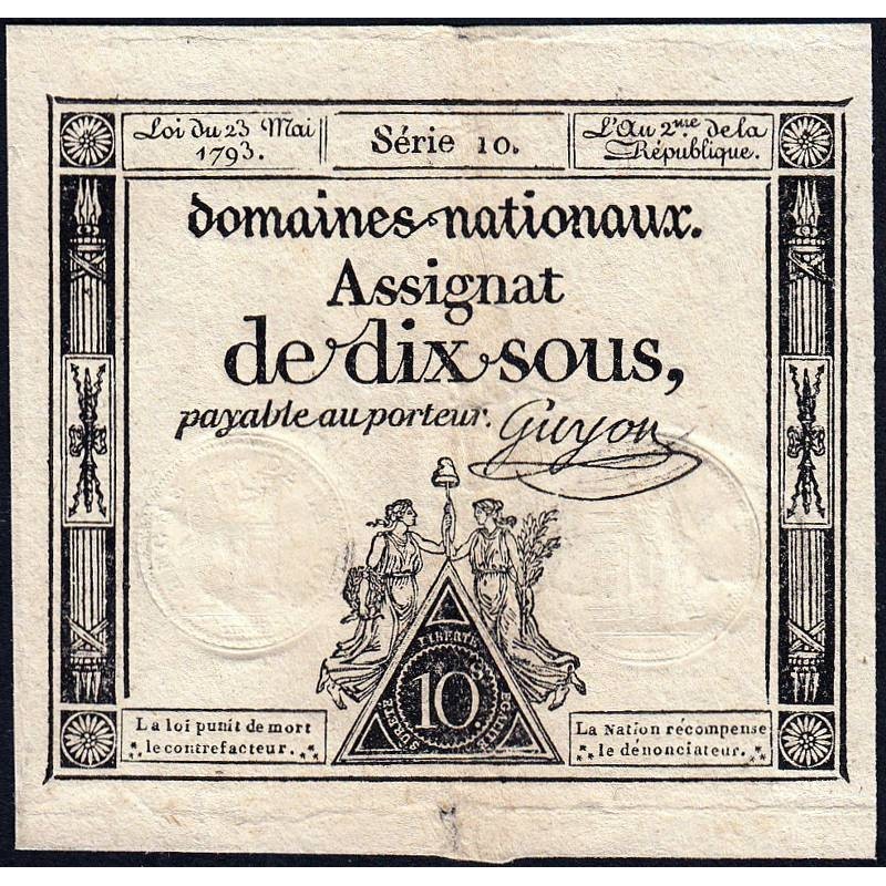 Assignat 40a - 10 sous - 23 mai 1793 - Série 10 - Filigrane royal - Etat : TTB
