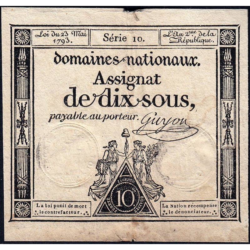 • Assignat 40a - 10 sous - 23 mai 1793 - Série 10 - Filigrane royal - Etat : TB+