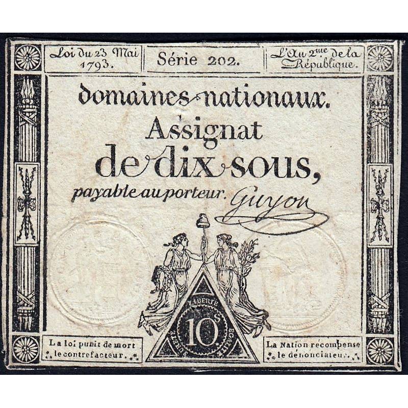 • Assignat 40b - 10 sous - 23 mai 1793 - Série 202 - Filigrane républicain - Etat : TB+