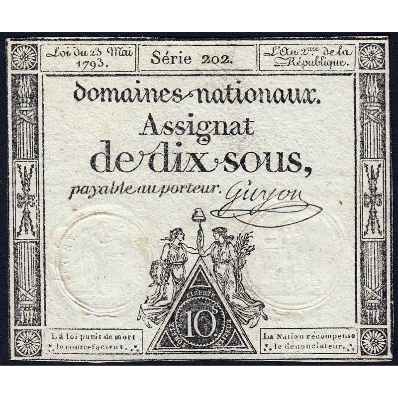 • Assignat 40b - 10 sous - 23 mai 1793 - Série 202 - Filigrane républicain - Etat : TTB