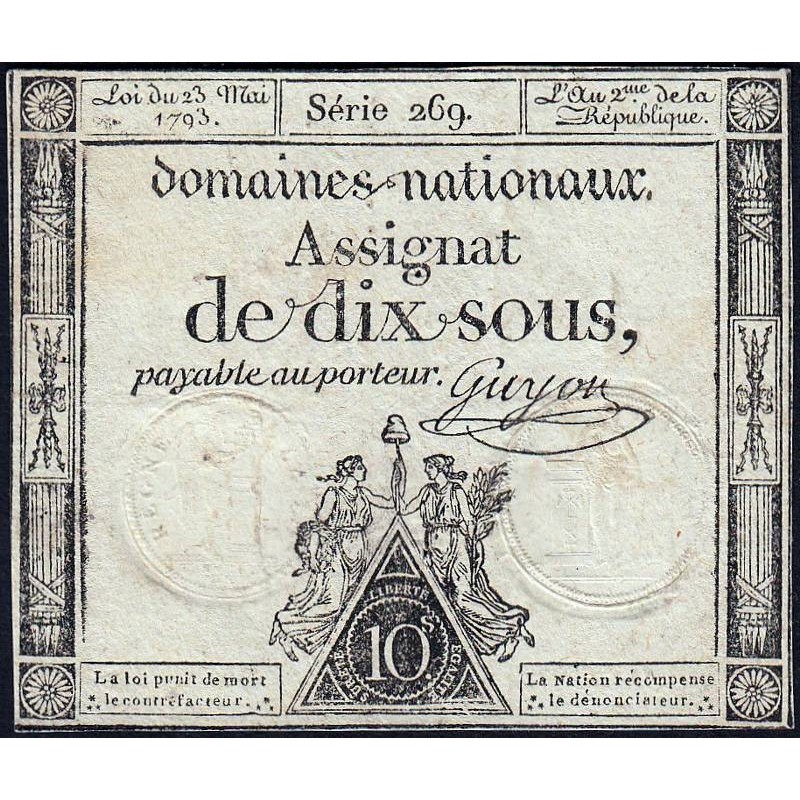 • Assignat 40b - 10 sous - 23 mai 1793 - Série 269 - Filigrane républicain - Etat : TB+