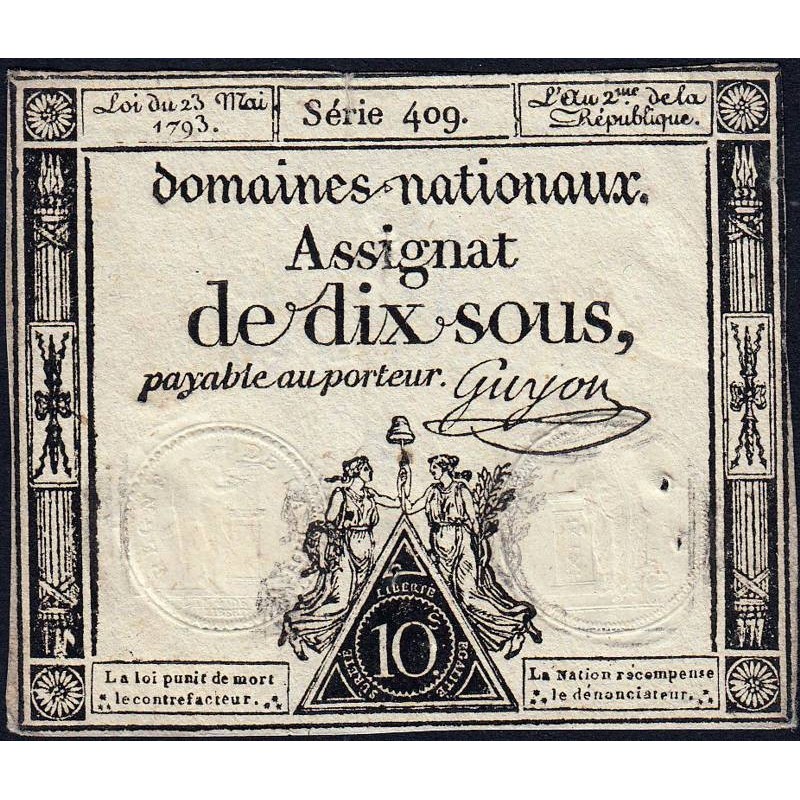 • Assignat 40b - 10 sous - 23 mai 1793 - Série 409 - Filigrane républicain - Etat : TTB