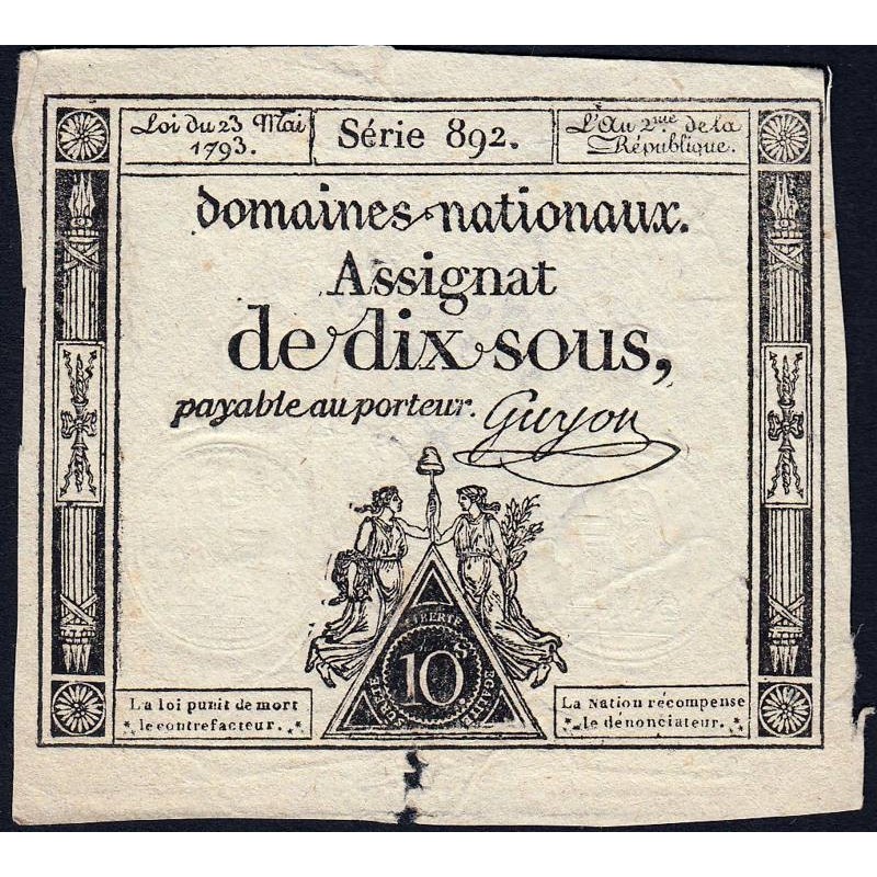 • Assignat 40c - 10 sous - 23 mai 1793 - Série 892 - Filigrane républicain - Etat : TB