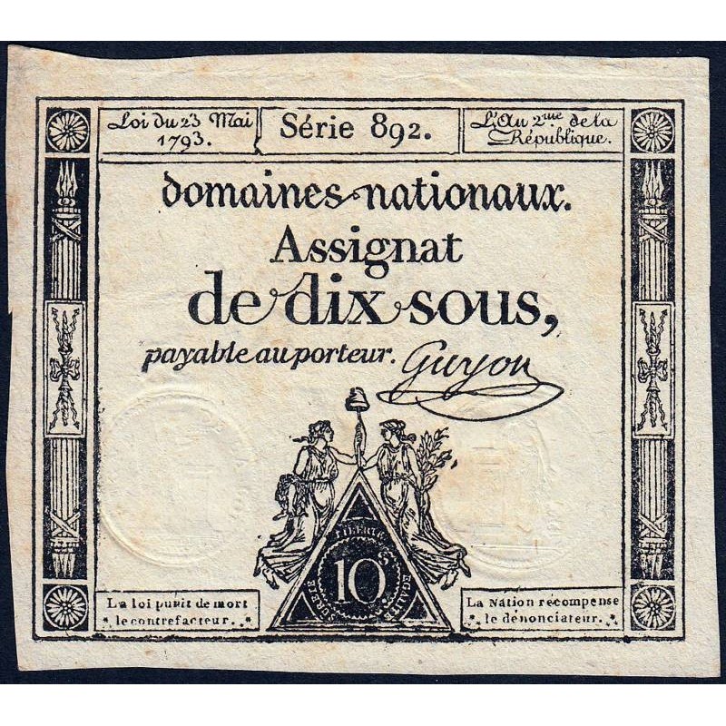 Assignat 40c - 10 sous - 23 mai 1793 - Série 892 - Filigrane républicain - Etat : TTB+