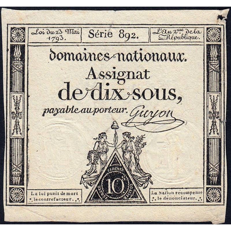 Assignat 40c - 10 sous - 23 mai 1793 - Série 892 - Filigrane républicain - Etat : TTB