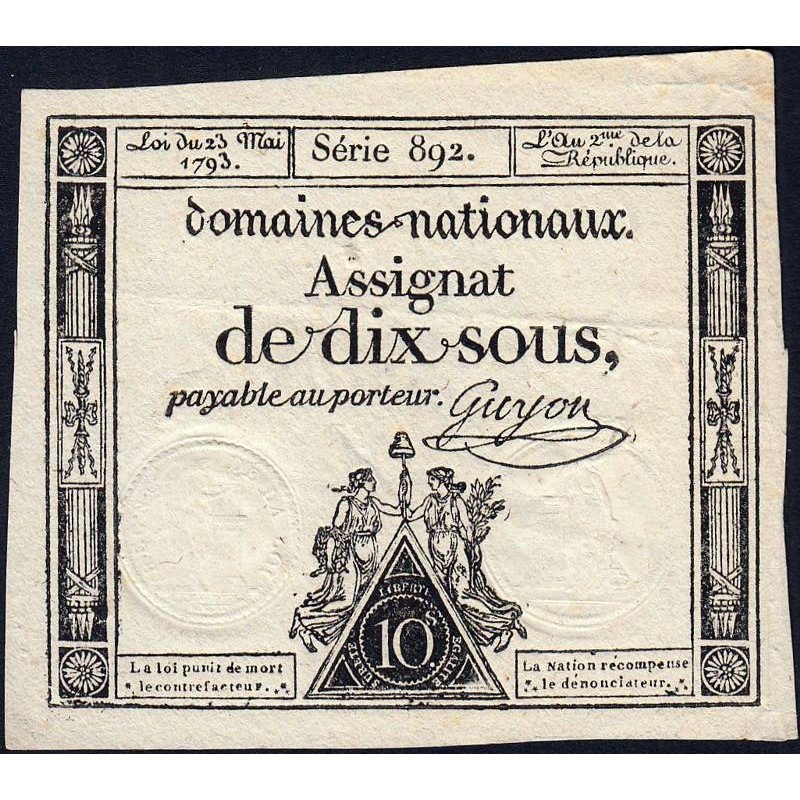 Assignat 40c - 10 sous - 23 mai 1793 - Série 892 - Filigrane républicain - Etat : TTB+