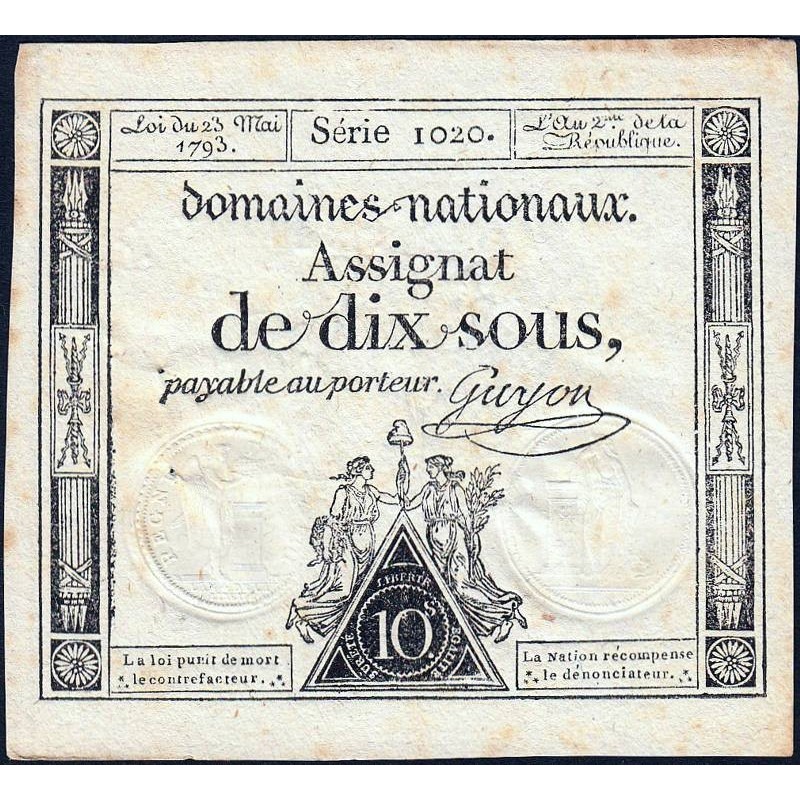 Assignat 40c - 10 sous - 23 mai 1793 - Série 1020 - Filigrane républicain - Etat : TTB