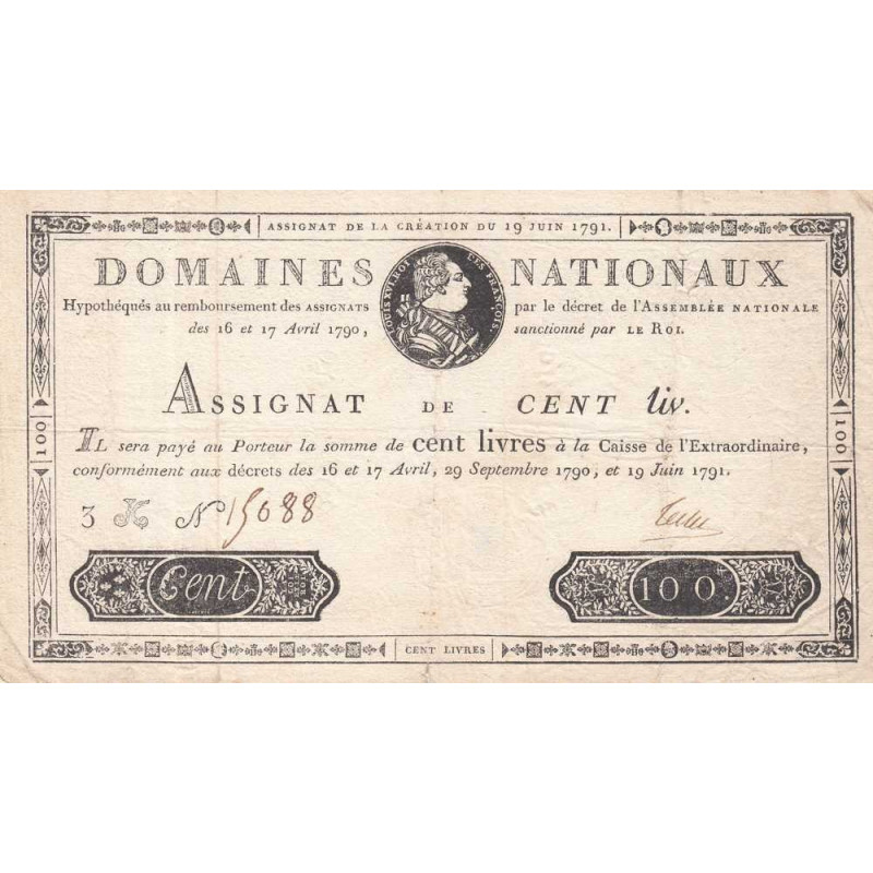 • Assignat 15a - 100 livres - 19 juin 1791 - Série 3K - Etat : TTB-