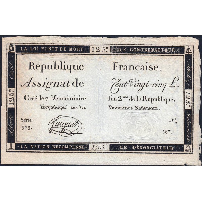 Assignat 44a - 125 livres - 7 vendémiaire an 2 - Signature 25 - Série 973 - Etat : SUP