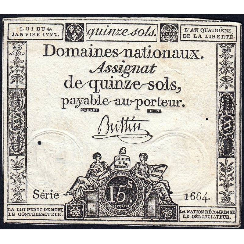 • Assignat 24a - 15 sols - 4 janvier 1792 - Série 1664 - Etat : TTB