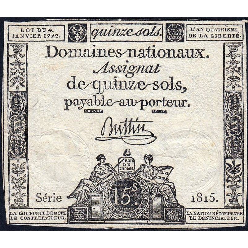 • Assignat 24a - 15 sols - 4 janvier 1792 - Série 1815 - Etat : TB+