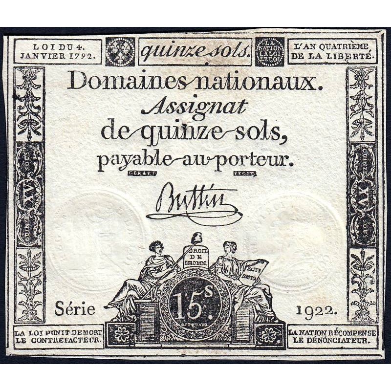 Assignat 24a - 15 sols - 4 janvier 1792 - Série 1922 - Etat : TTB