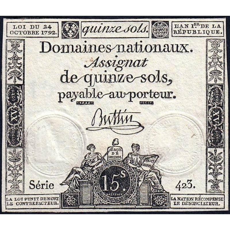 Assignat 35a - 15 sols - 24 octobre 1792 - Série 423 - Etat : TTB+
