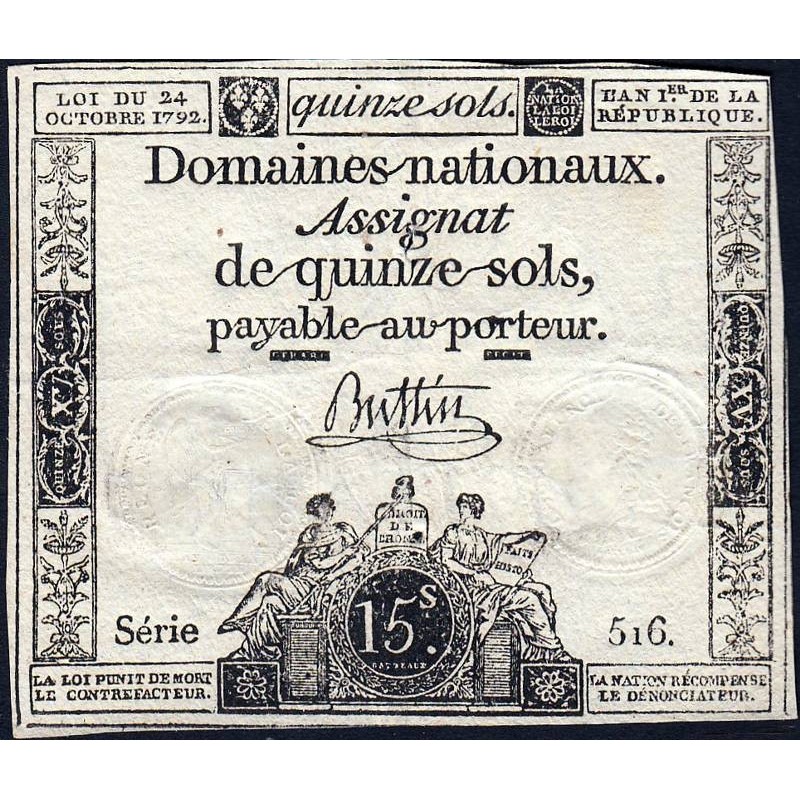 Assignat 35a - 15 sols - 24 octobre 1792 - Série 516 - Etat : TB+