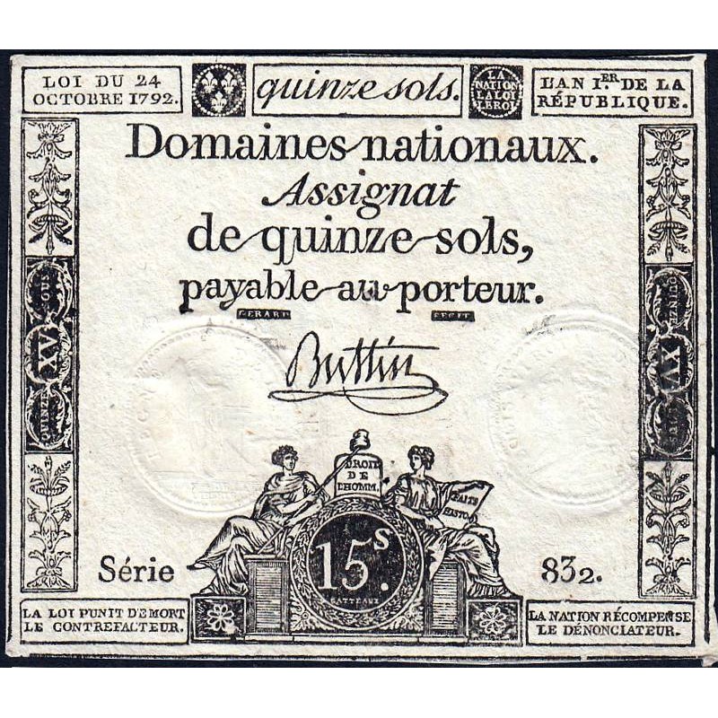 Assignat 35a - 15 sols - 24 octobre 1792 - Série 832 - Etat : SUP