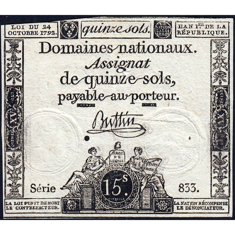 Assignat 35a - 15 sols - 24 octobre 1792 - Série 833 - Etat : TB
