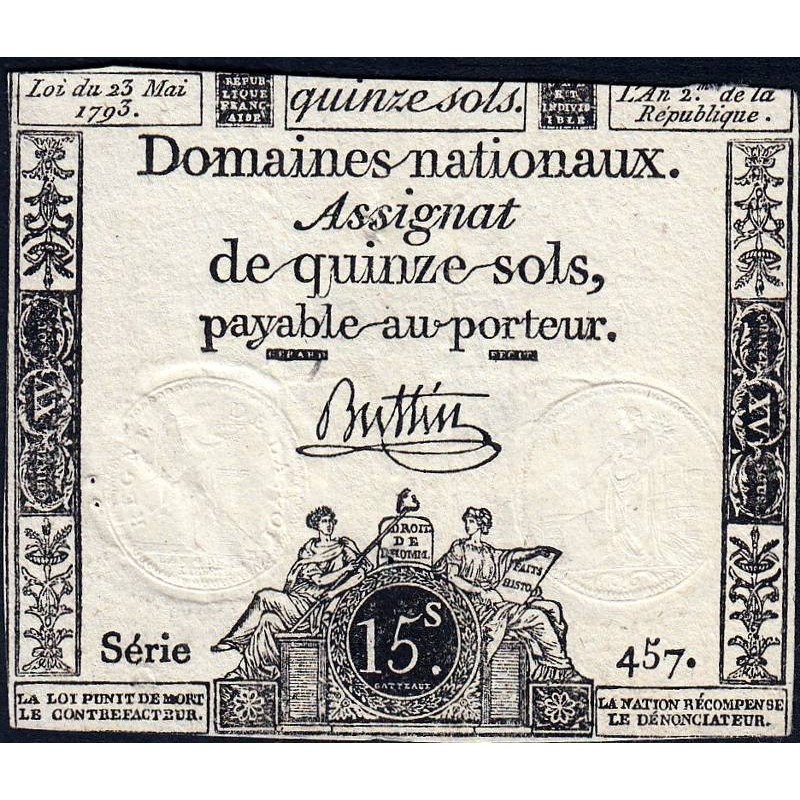 Assignat 41b - 15 sols - 23 mai 1793 - Série 457 - Filigrane républicain - Etat : TB-