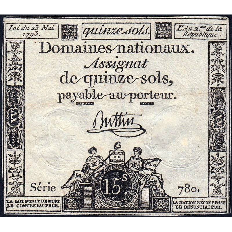 • Assignat 41b - 15 sols - 23 mai 1793 - Série 780 - Filigrane républicain - Etat : TTB+