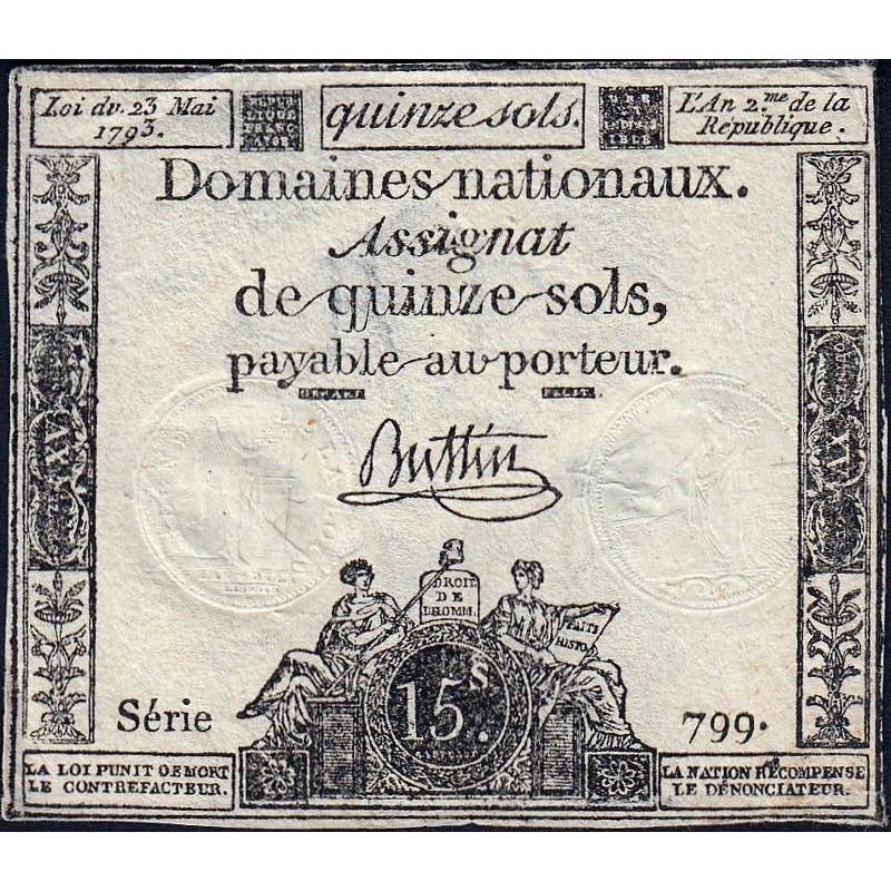 • Assignat 41b - 15 sols - 23 mai 1793 - Série 799 - Filigrane républicain - Etat : TTB