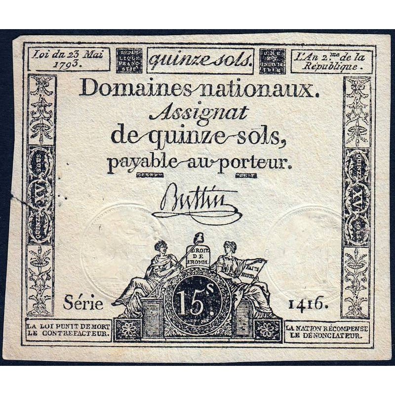 Assignat 41b - 15 sols - 23 mai 1793 - Série 1416 - Filigrane républicain - Etat : TB+