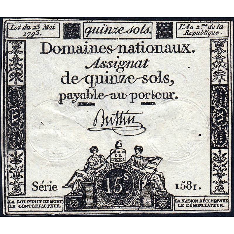 Assignat 41b - 15 sols - 23 mai 1793 - Série 1581 - Filigrane républicain - Etat : TTB