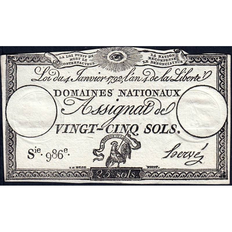 Assignat 25a - 25 sols - 4 janvier 1792 - Série 986 - Etat : TTB