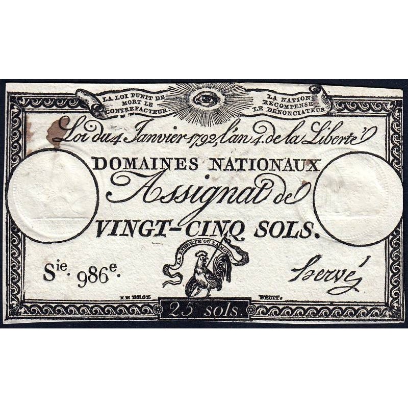 Assignat 25a - 25 sols - 4 janvier 1792 - Série 986 - Etat : TTB+