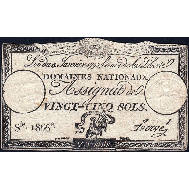 Assignat 25a - 25 sols - 4 janvier 1792 - Série 1866 - Etat : TB
