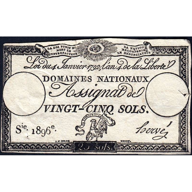 Assignat 25a - 25 sols - 4 janvier 1792 - Série 1896 - Etat : TB