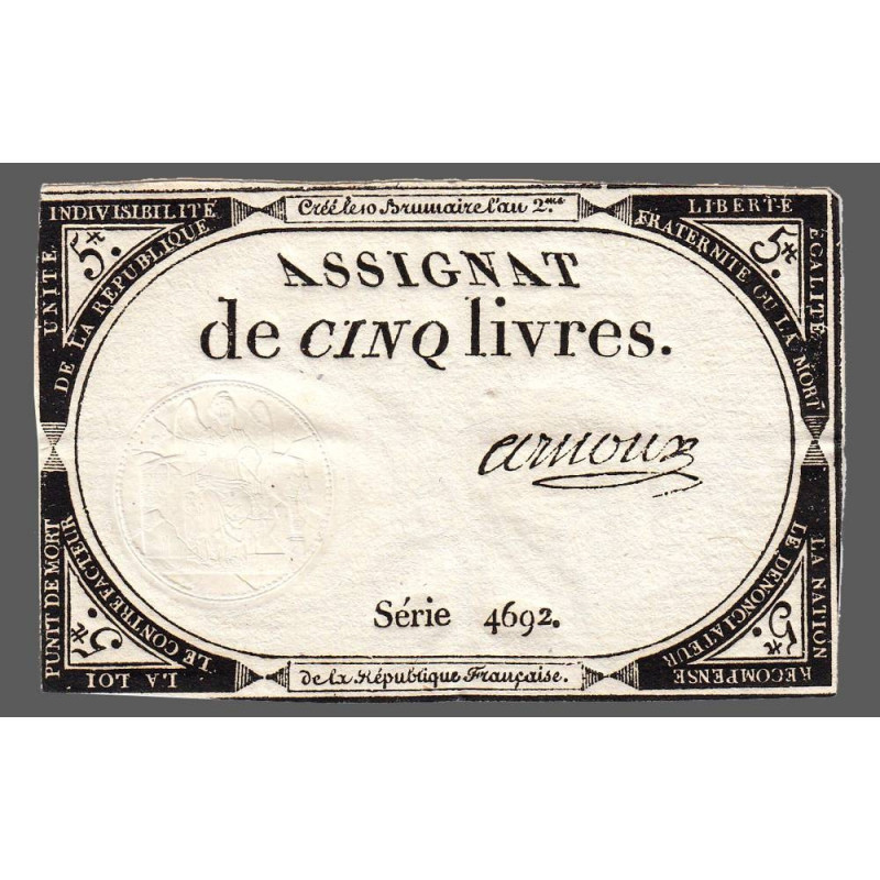 • Assignat 46a - 5 livres - 10 brumaire an 2 - Signature 2 - Etat : SUP
