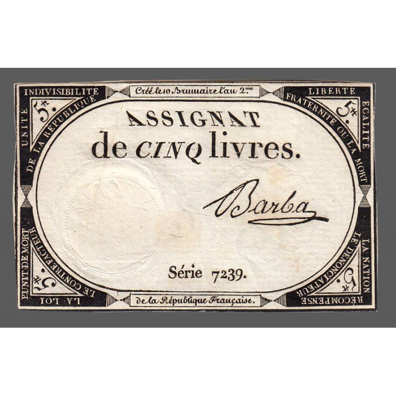 • Assignat 46a - 5 livres - 10 brumaire an 2 - Signature 9 - Etat : SUP