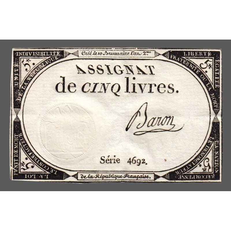 • Assignat 46a - 5 livres - 10 brumaire an 2 - Signature 10 - Etat : SUP