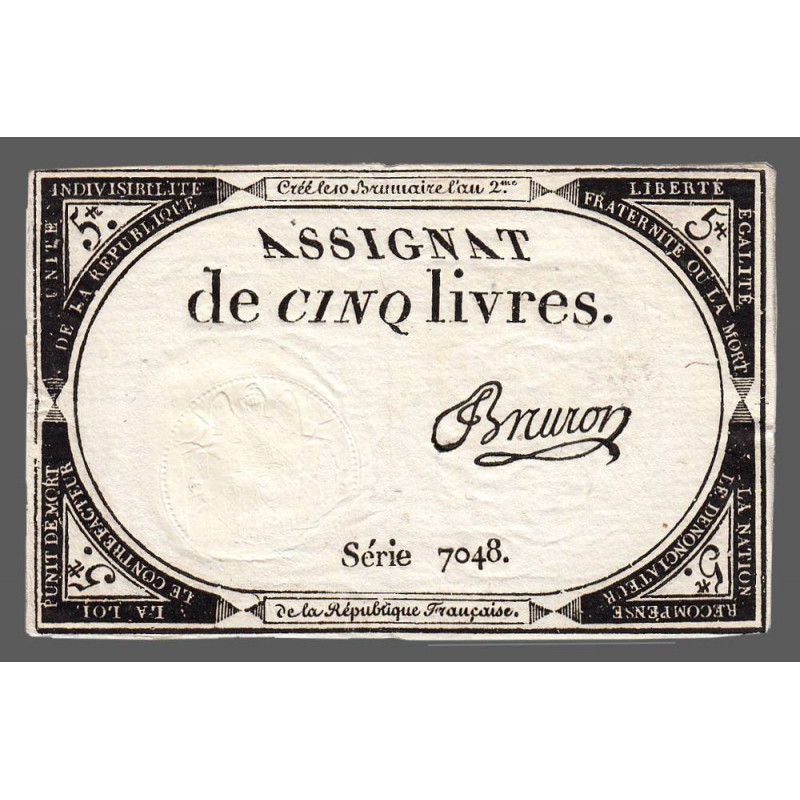 • Assignat 46a - 5 livres - 10 brumaire an 2 - Signature 21 - Etat : SUP