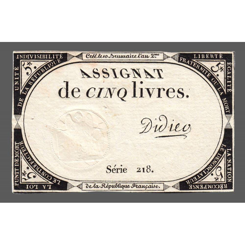 • Assignat 46a - 5 livres - 10 brumaire an 2 - Signature 30 - Etat : SUP
