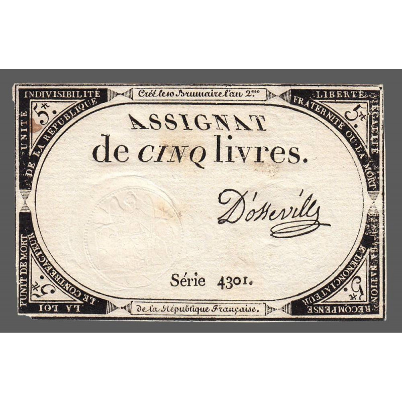 • Assignat 46a - 5 livres - 10 brumaire an 2 - Signature 31 - Etat : TTB+