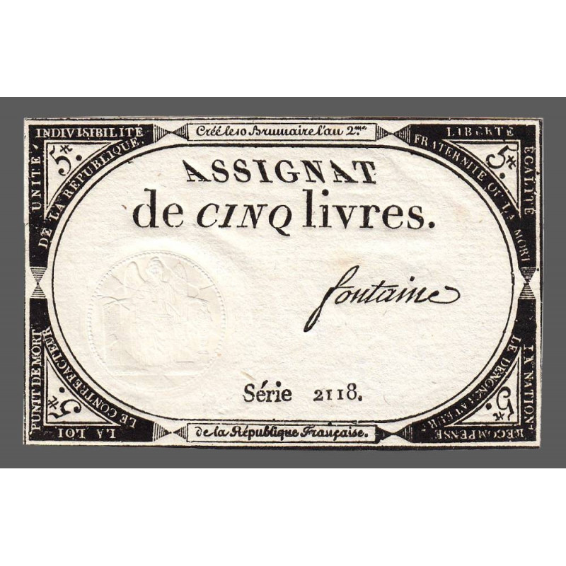 Assignat 46a - 5 livres - 10 brumaire an 2 - Signature 46 - Etat : SUP
