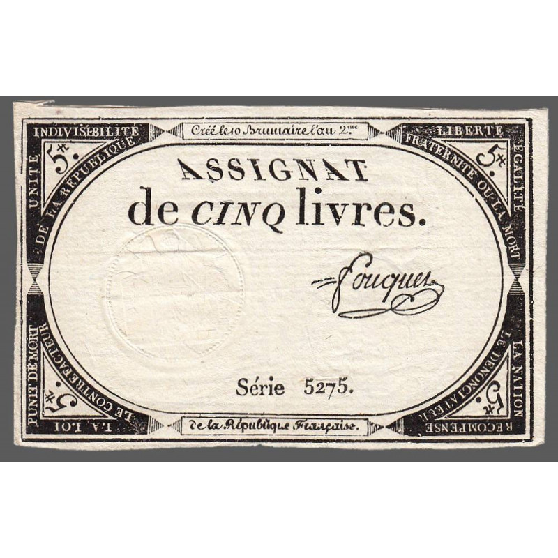 Assignat 46a - 5 livres - 10 brumaire an 2 - Signature 47 - Etat : SUP