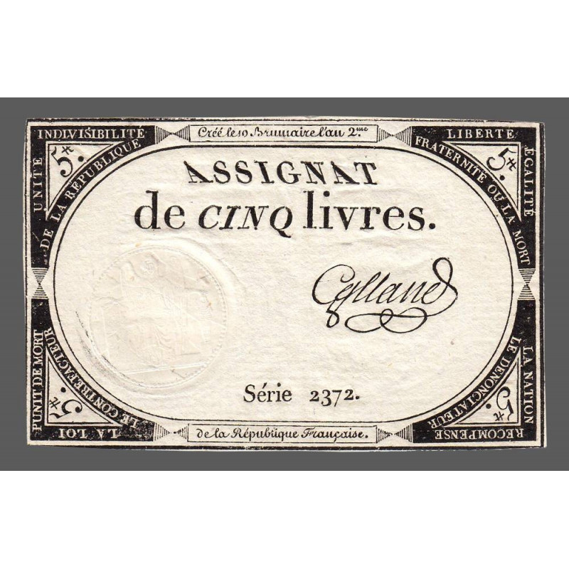 • Assignat 46a - 5 livres - 10 brumaire an 2 - Signature 48 - Etat : SUP