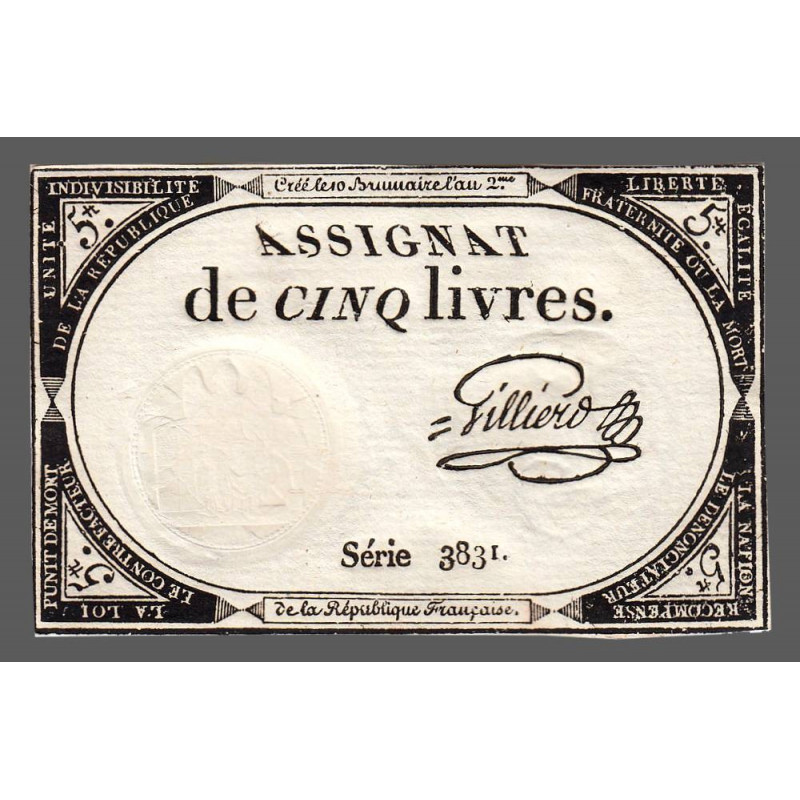 • Assignat 46a - 5 livres - 10 brumaire an 2 - Signature 52 - Etat : SUP
