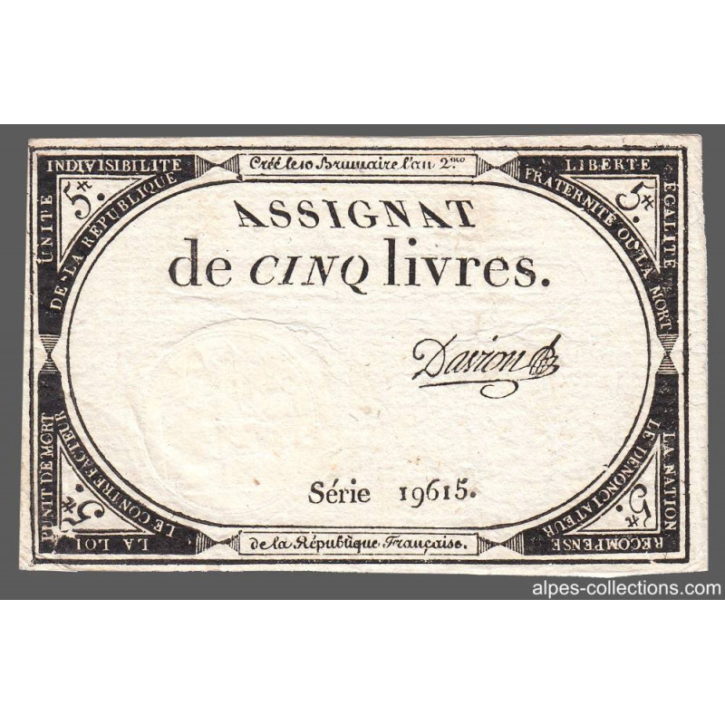 Assignat 46a - 5 livres - 10 brumaire an 2 - Signature 27 - Etat : TTB