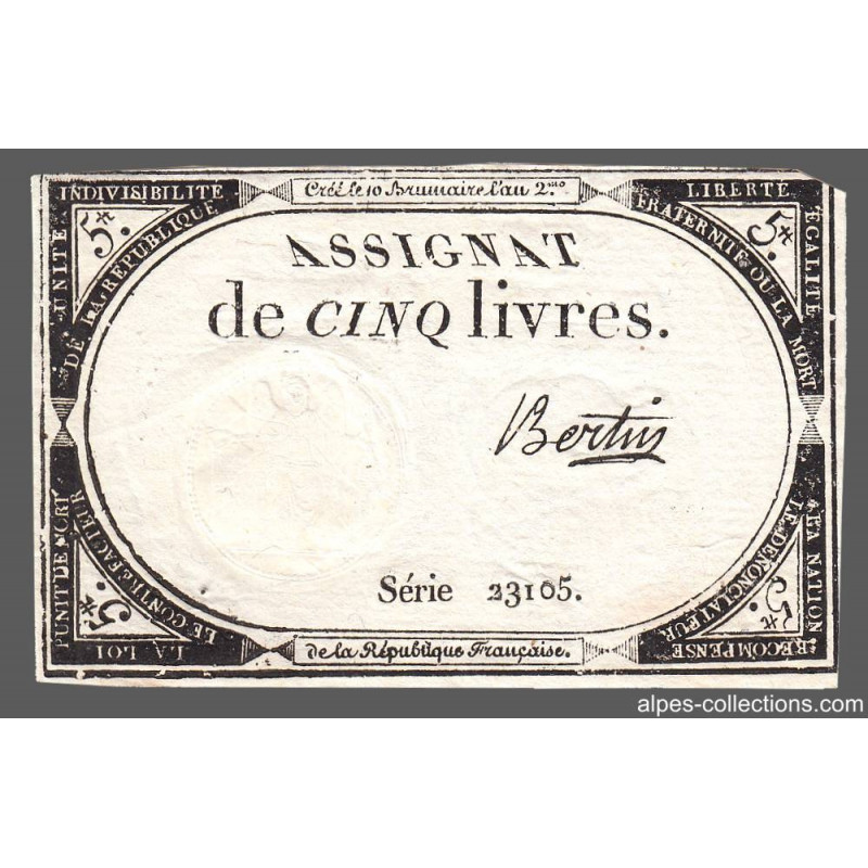 Assignat 46a - 5 livres - 10 brumaire an 2 - Signature 15 - Etat : TTB+