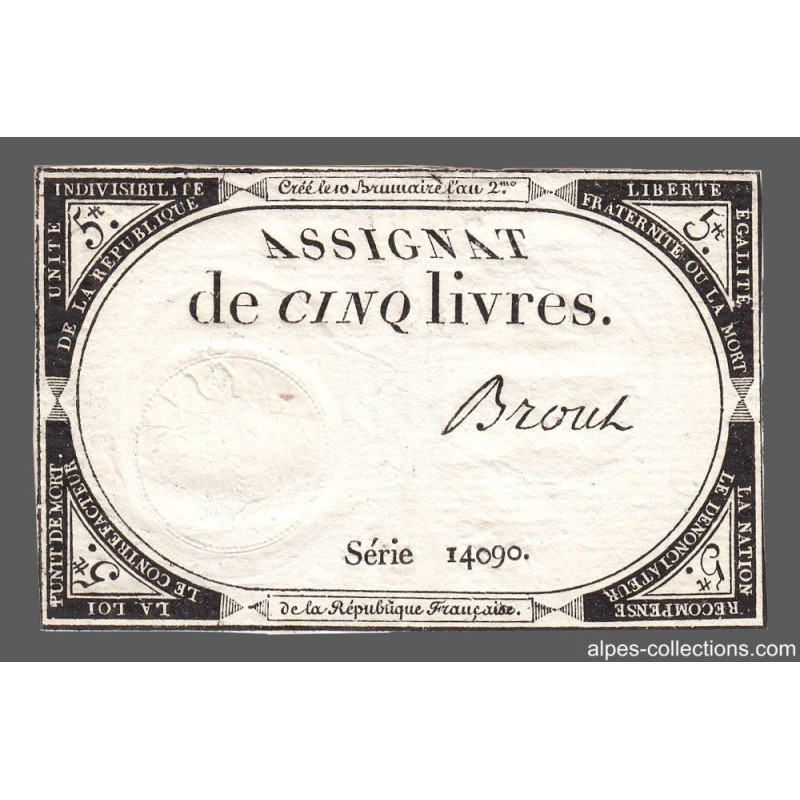 • Assignat 46a - 5 livres - 10 brumaire an 2 - Signature 19 - Etat : SUP