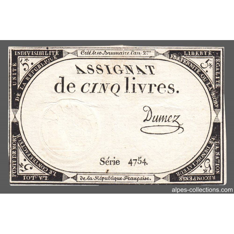 Assignat 46a - 5 livres - 10 brumaire an 2 - Signature 37 - Etat : TTB+