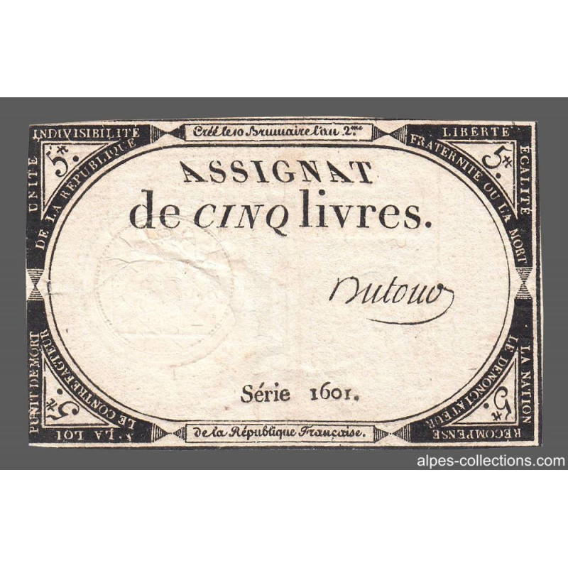 • Assignat 46a - 5 livres - 10 brumaire an 2 - Signature 38 - Etat : TB+