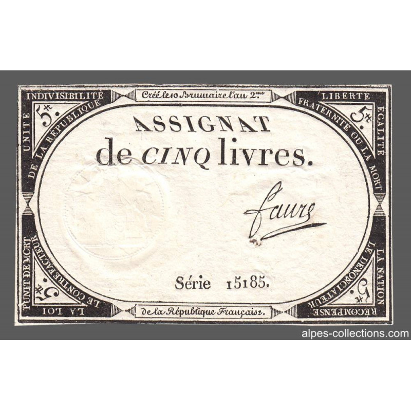 • Assignat 46a - 5 livres - 10 brumaire an 2 - Signature 43 - Etat : TTB+
