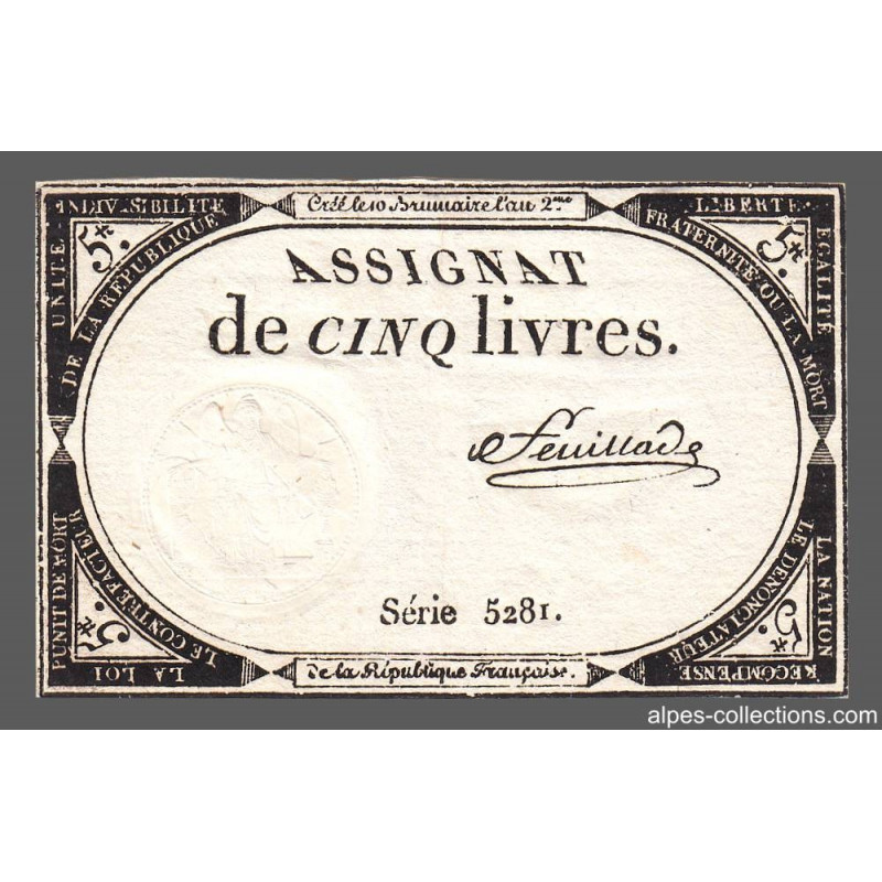 • Assignat 46a - 5 livres - 10 brumaire an 2 - Signature 45 - Etat : TTB+