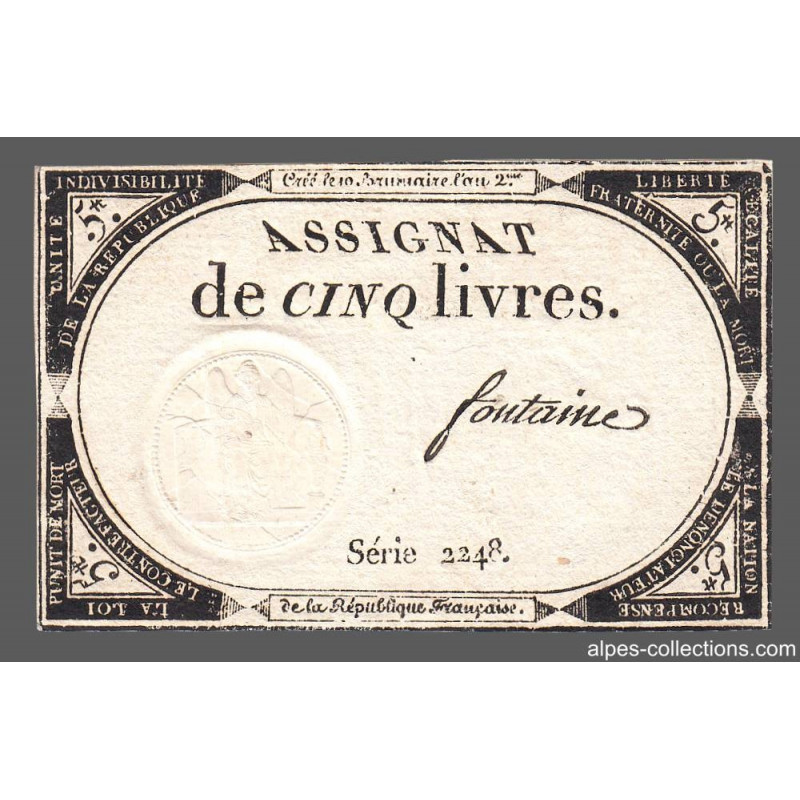 Assignat 46a - 5 livres - 10 brumaire an 2 - Signature 46 - Etat : TTB+