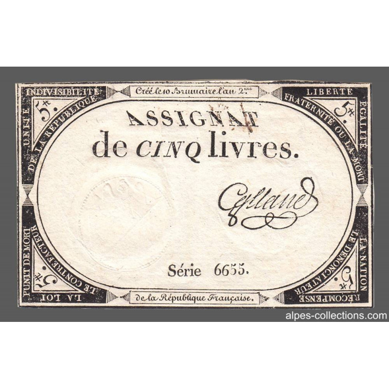 • Assignat 46a - 5 livres - 10 brumaire an 2 - Signature 48 - Etat : TTB+